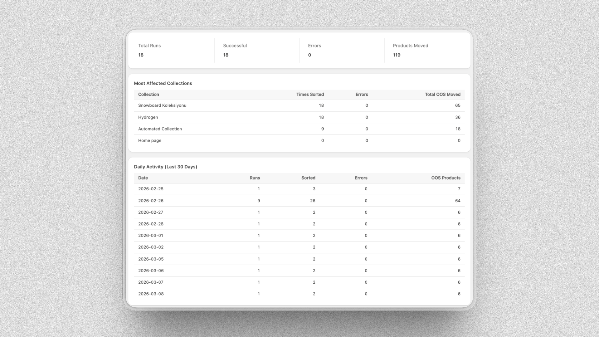Outranked keeps in-stock products visible first, moves sold-out products down automatically, and sends your team a clear summary after every run.